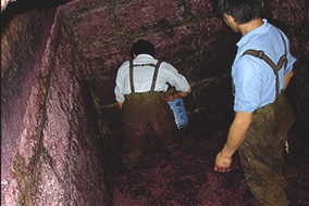 果梗を付けたまま果皮、果肉、果汁を石蔵内に注ぎ入れます。 |